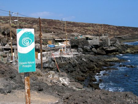 Foto 1: Este cartel indica el acceso al espacio protegido. Dentro de los límites del mismo (detrás del cartel) vemos unas casas cueva construidas en plena costa, y que, a pesar de todo, tienen iluminación pública, facilitada por el Ayuntamiento de Güímar. Este ayuntamiento tiene la fea costumbre de dar servicios públicos a muchas viviendas ilegales situadas en la costa del municipio. |