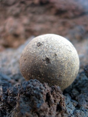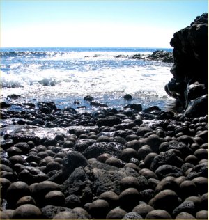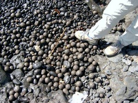 Foto 2: Una playa llena de "bolas de piche". Se forman al rodear el piche, mezclado con arena, un callao de la costa, quedándose pegado completamente, y formando estas curiosas "bolas". En la foto 5 hay un primer plano. |
