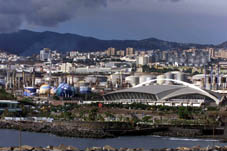 Foto 1: En esta foto vemos, en primer lugar, los diques del muelle. Luego, el parque marítimo de Santa Cruz y el recinto ferial. Inmediatamente después, está la refinería, cuyos tanques han pintado de colores, para disimular. Por último, vemos todos los barrios de la ciudad, rodeando el conjunto. |