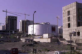 El espacio cultural "El Tanque", rodeado de edificios. Se trata de un antiguo depósito de combustible de la refinería, que, hasta hace unos años, estaba rodeado de otros similares. Al comprar el Ayuntamiento estos terrenos a la refinería, el Cabildo decidió mantener este tanque, y transformarlo en un espacio cultural, que está en funcionamiento aún hoy. Nótese como se construye alrededor, a toda velocidad, en terrenos que son anexos a la refinería. Ir a... |