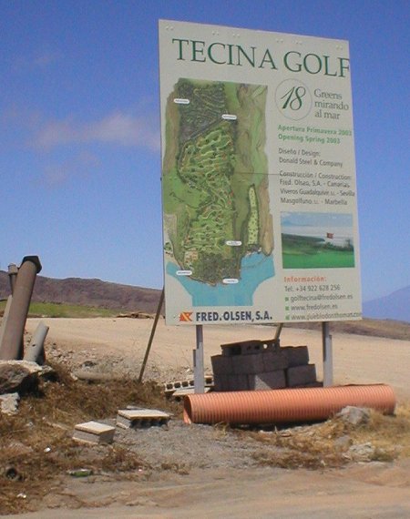 Foto 1: Cartel de la obra del campo de golf. En él se aprecia la gran extensión, en comparación, por ejemplo, con la actual superficie del Hotel Tecina. La fecha de terminación de las obras, como siempre, no es muy real. |