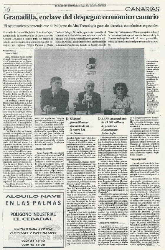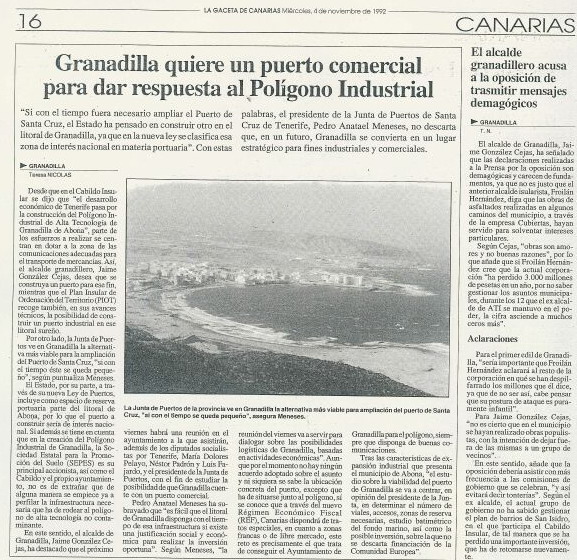 Los siguientes dos artículos pertenecen a periódicos de 1992, donde Pedro Anatael apoya el Puerto de Granadilla y que nos ha remitido el Tagoror Ecologista Alternativo TEA (www.nodo50.org/tea), quien comparte con ATAN la necesidad