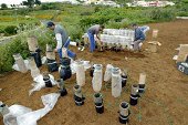 La primera foto muestra el estado en el que quedó el lugar desde dónde se lanzaron los fuegos. Como vemos, además de un desorden de sacos de arena y bloques tirados por todas partes, destaca la gran cantidad de restos, como las varillas de los voladores, soportes de plástico, trozos de cartón de varios colores, etc.